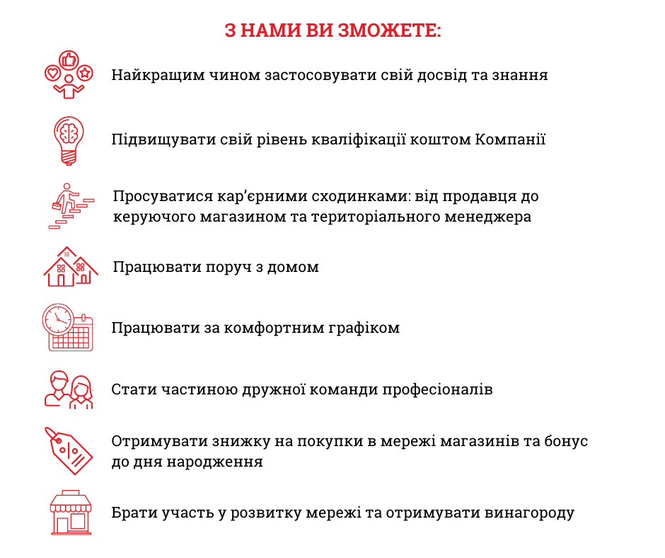 Вакансії в магазинах мережі в містах України: Київ, Біла Церква, Бердичів, Бориспіль, Боярка, Буча, Васильків, Вінниця, Вишневе, Вишгород, Дніпро, Житомир, Звягель, Золотоноша, Кам'янець-Подільський, Канів, Клавдієво-Тарасове, Коломия, Конотоп, Коцюбинське, Кривий Ріг, Луцьк, Львів, Радивилів, Радомишль, Рівне, Переяслав, Тарасівка, Черкаси, Чернігів, Харків, Хмельницький, Фастів: